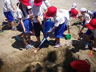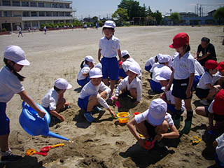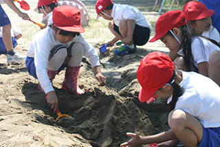 1組・2組合同で、「砂や土となかよくなろう」というめあてのもと、楽しい時間を過ごしました。大きな山の中にトンネルを作ったり、穴に水を流したりして、砂や土となかよくなりました。