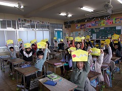 読書感想画の表彰があり、入選の1年生が校長先生から表彰状受け取りました。