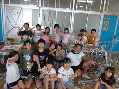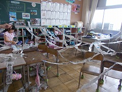 新聞紙を使い、班の子同士で協力して教室を作品に仕上げました。
