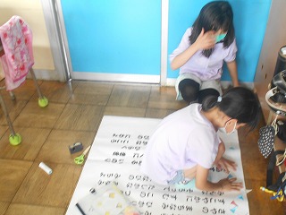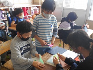 校歌の紙を拡大して、その周りに折り紙で飾り付けをしました。何を作って飾ると1年生が喜ぶのか、みんなで意見を出し合い、キャラクターや春らしいもの、学校に関するもののおり方をタブレットで検索して、折って飾り付けをしました。