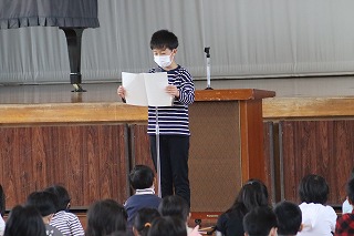 今日は後期の始まりの集会があり、2・4・6年生の代表が話をしました。4年生の代表として、自分が頑張っていることと、学年でがんばっていることを話しました。緊張したと思いますが、しっかりと話をする姿はとても立派でした。