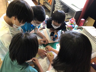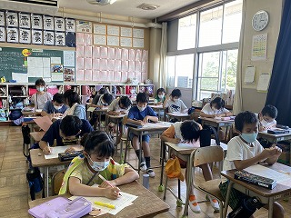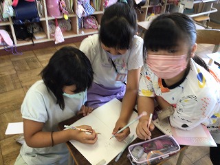今日もとても暑く、教室は常に冷房をつけ扇風機を回しています。休み時間に外で遊ぶのも今は難しい状態です。なので図書室に行ったり、絵を描く練習をしたり、友達とおしゃべりしたりして遊んでいます。