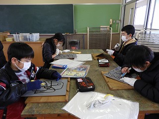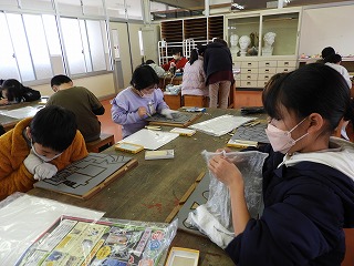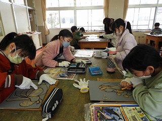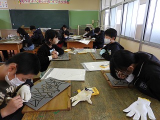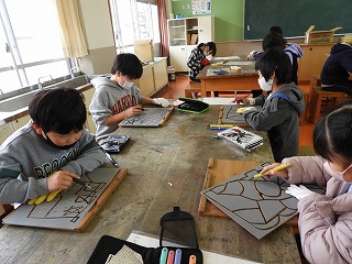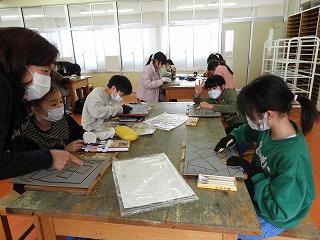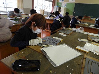 1~3年生までは、紙版画だったので、今回初めて彫刻刀を使って作品作りをしています。集中して取り組んでいる様子がとても良いなと思います。