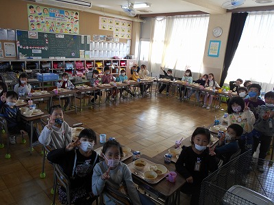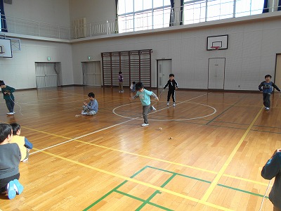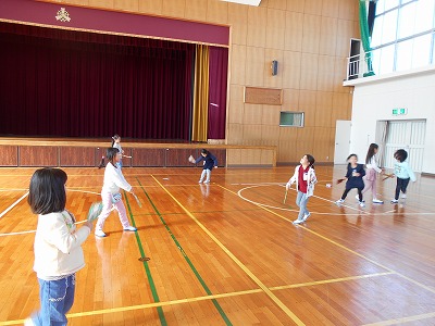 教室では、「ベロ出しゲーム」と「はんかち落とし」をしました。