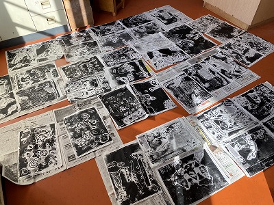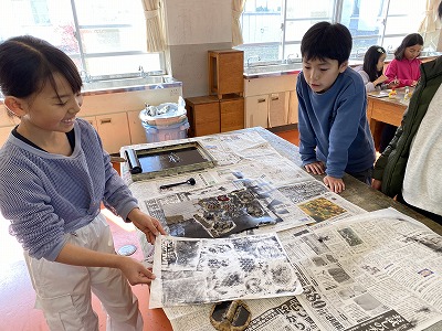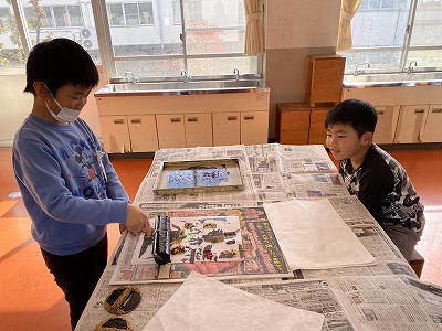 図工では、段ボールやプチプチで作った版に、インクをつけて刷りました。