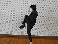 膝を両手でかかえ、むねにつくように引っ張ります。これを左右で10回ずつ行いましょう。