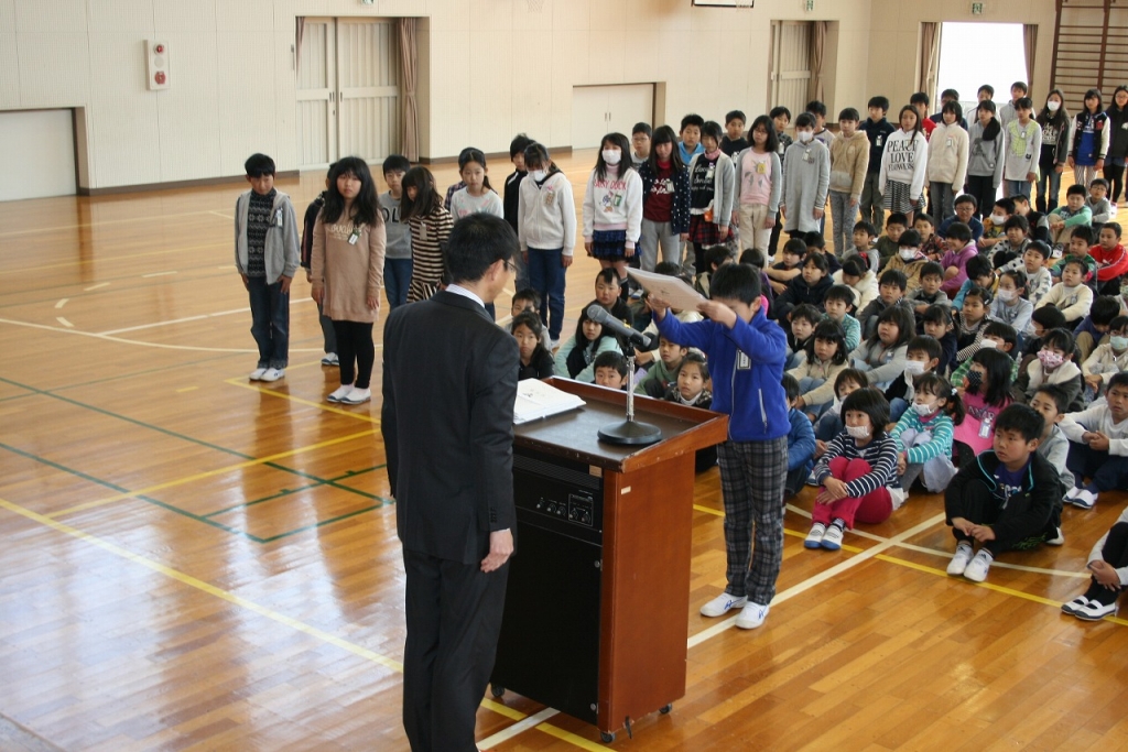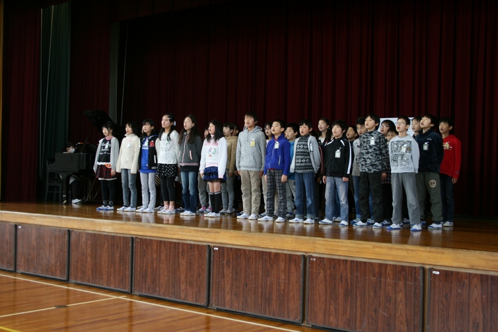 修了式の後、全校合唱を行い、5年生は卒業式で歌った「はばたこう明日へ」を、1~4年生に披露しました。1週間ぶりの合唱でしたが、全員で呼吸を合わせて歌うことができました。