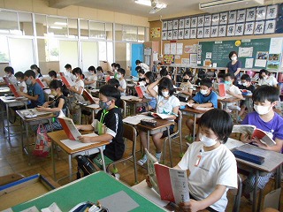 国語は「一つの花」の学習をしています。教育実習の先生との授業で、ゆみ子の「一つだけちょうだい」という言葉の意味を考えたり、コスモスに込められた思いを想像したりしてきました。今日の授業では、感想をお互いに発表しました。