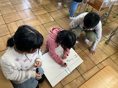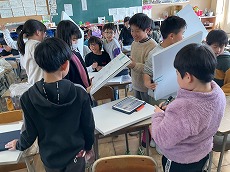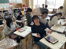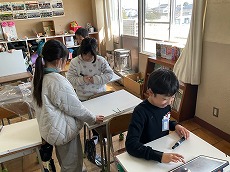 3年生は作品バック作りの様子を紹介します。好きな絵を描いたり、お互いにメッセージを書き合ったりする姿が見られました。