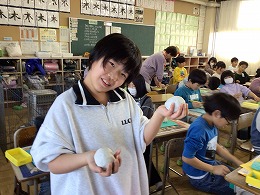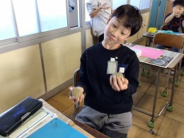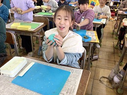 理科では、重さについて学び始めました。粘土の形が変わっても重さが変わらないかどうか試してみました。「丸のほうが重く感じる」「変わらない」といろいろな感想が出ました。