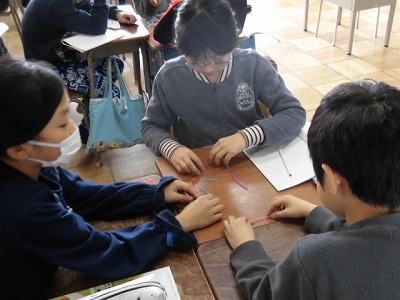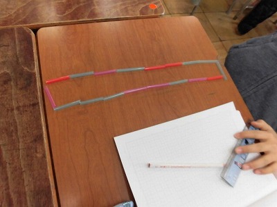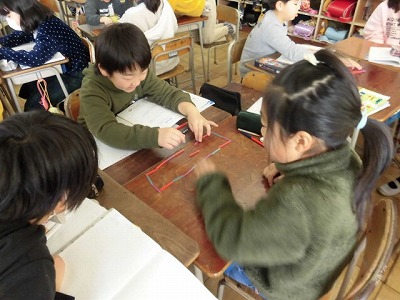 グループになって、18本のストローで長方形を作り、たての本数と横の本数を比べました。