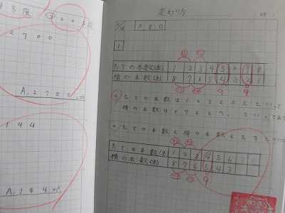 算数では、二つの関係する数の変わり方を、表を使って学んでいます。