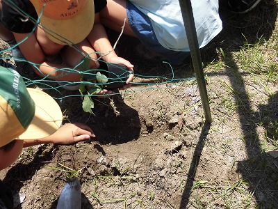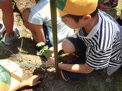 ポットで育てていたヘチマの苗を、広い畑の方に植え替えました。