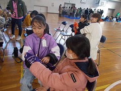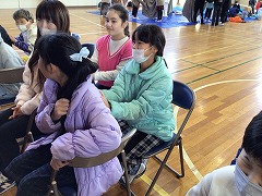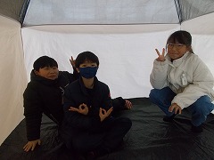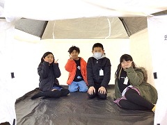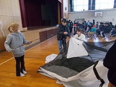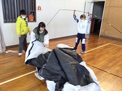 高学年は、避難所テント体験、被災時のトイレの使用方法、ハンカチでの傷の手当、リラクゼーション、毛布で担架・ガウンを体験しました。