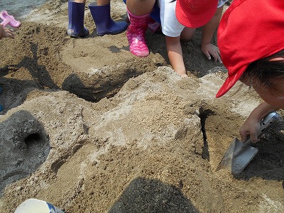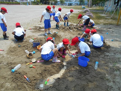校庭の砂場で、仲間と協力しながら、土を掘ったり、つなげたり、