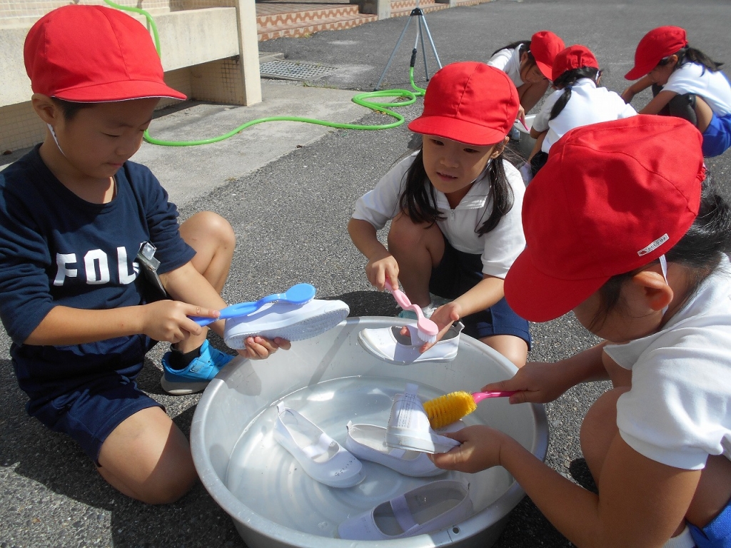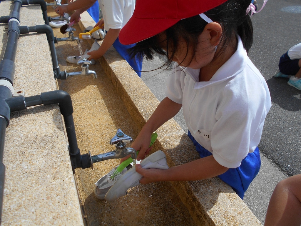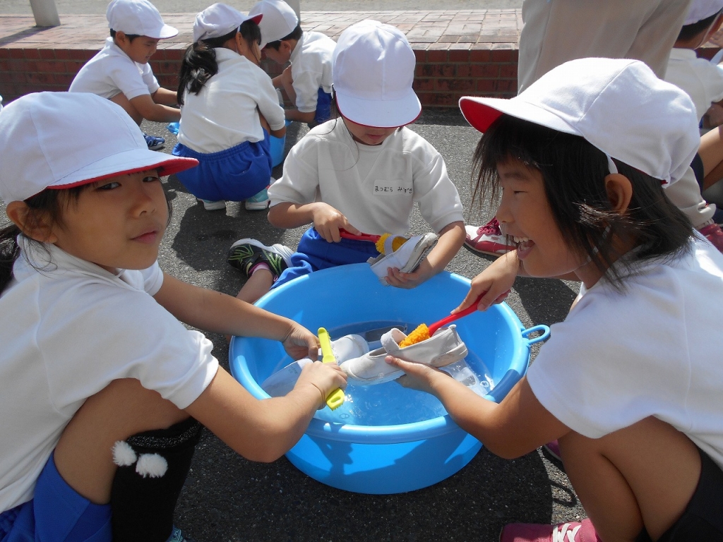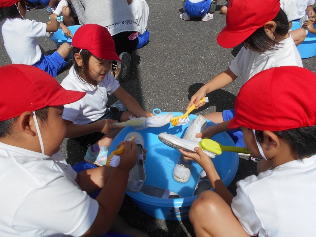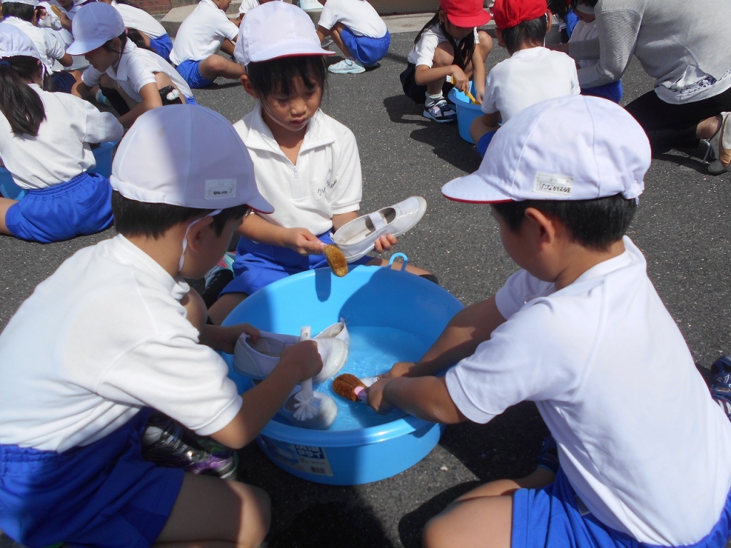 先週の宿題で、お家の仕事(お手伝い)をしてもらいました。いろいろな仕事を見つけて、頑張ってきました。そのまとめとして、今日みんなで靴洗いに挑戦しました。