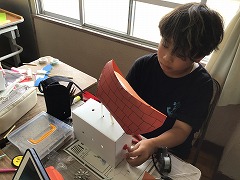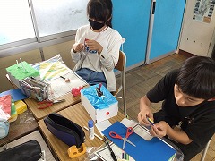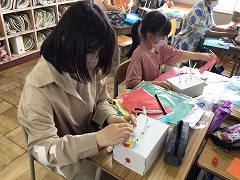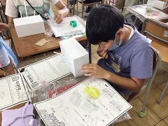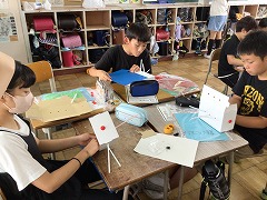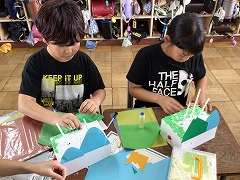 子どもたちは、先週考えた設計図を見ながら、針金や色紙、竹ひごなどあらゆる材料を使って、思い思いに取り組んでいます。