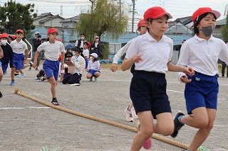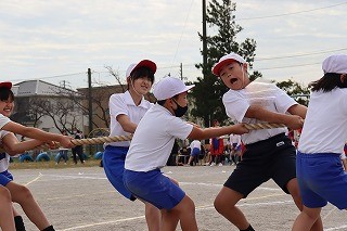 3・4年生競技の「追っかけ綱引き」は、「腕が痛い」「手のひらが真っ赤になった」と言いながら、綱を引いたり走ったりと頑張っていました。