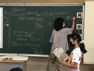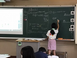 算数の授業の様子です。今日は「計算のきまり」について考えました。まずは1人で考えていくつかの式を立て、それを全体で意見交換をしました。