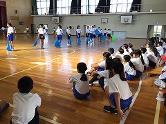 初めに6年生が5年生にお手本を見せました。その後、色ごとに分かれて6年生が5年生にやさしく振付を教えました。