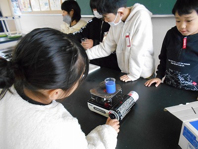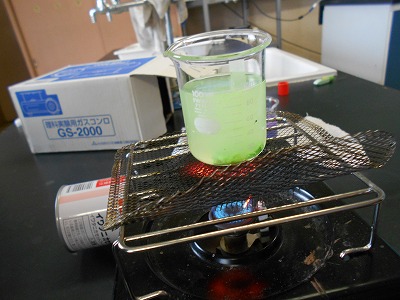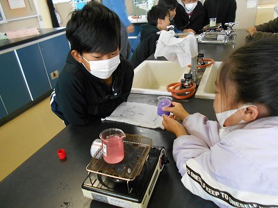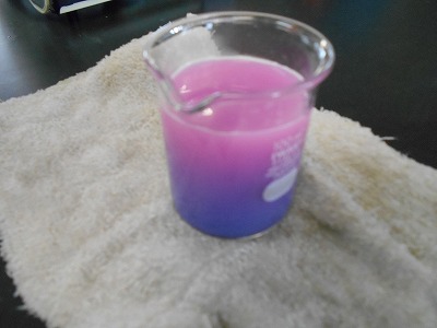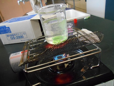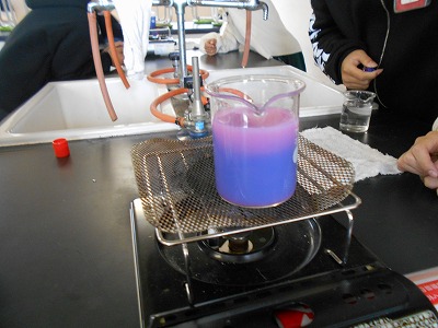 し温インクを入れた水を熱して、あたたまり方を調べました。