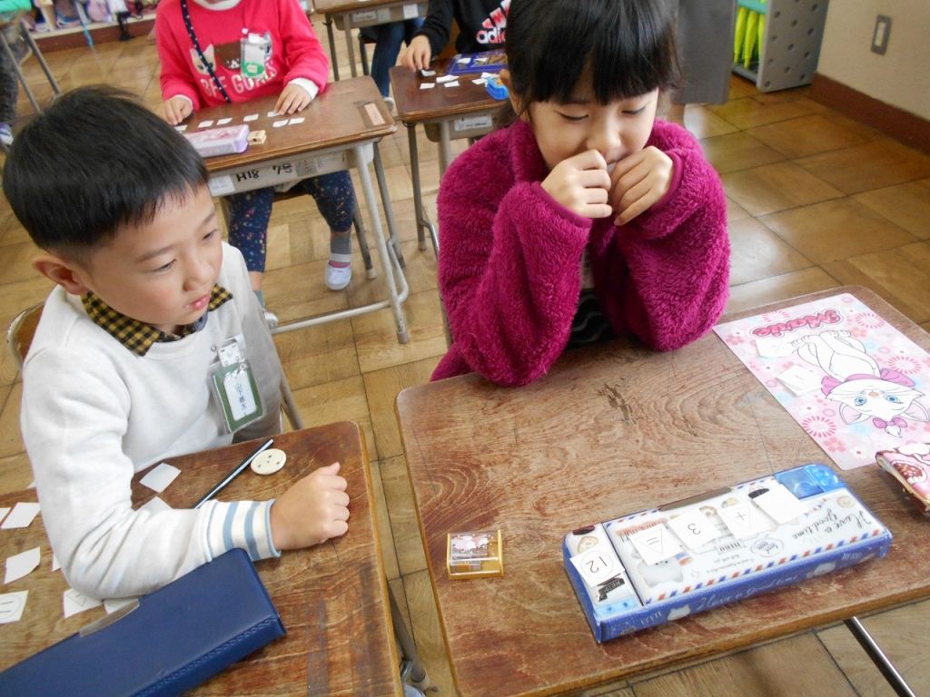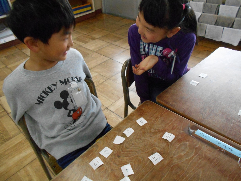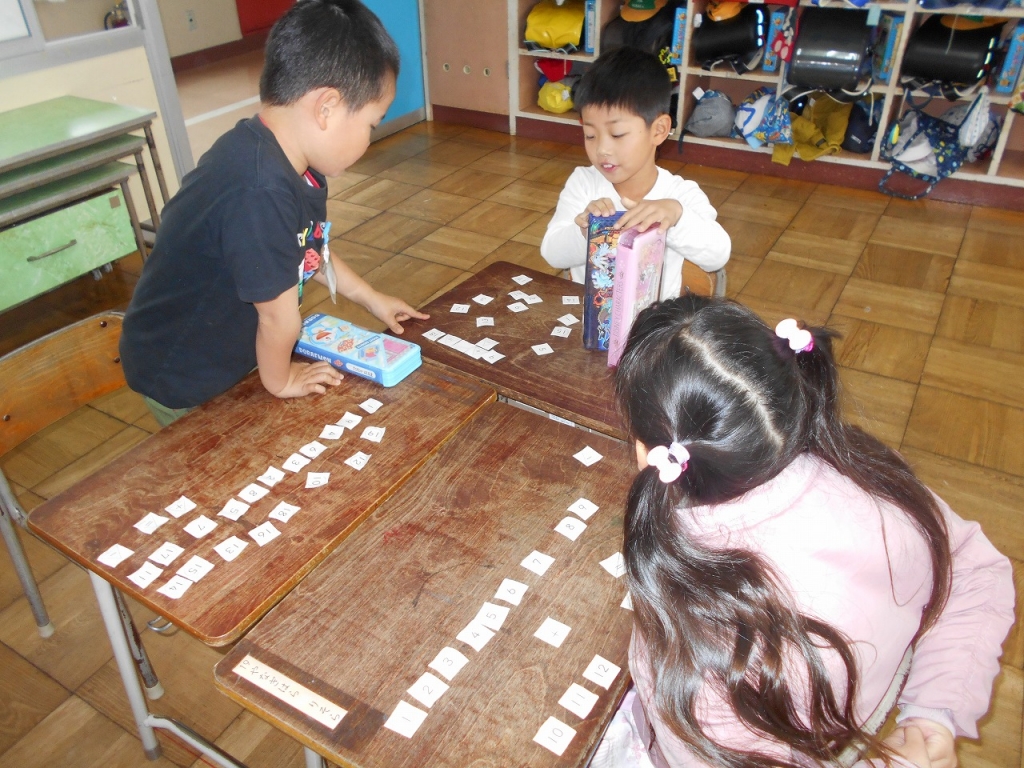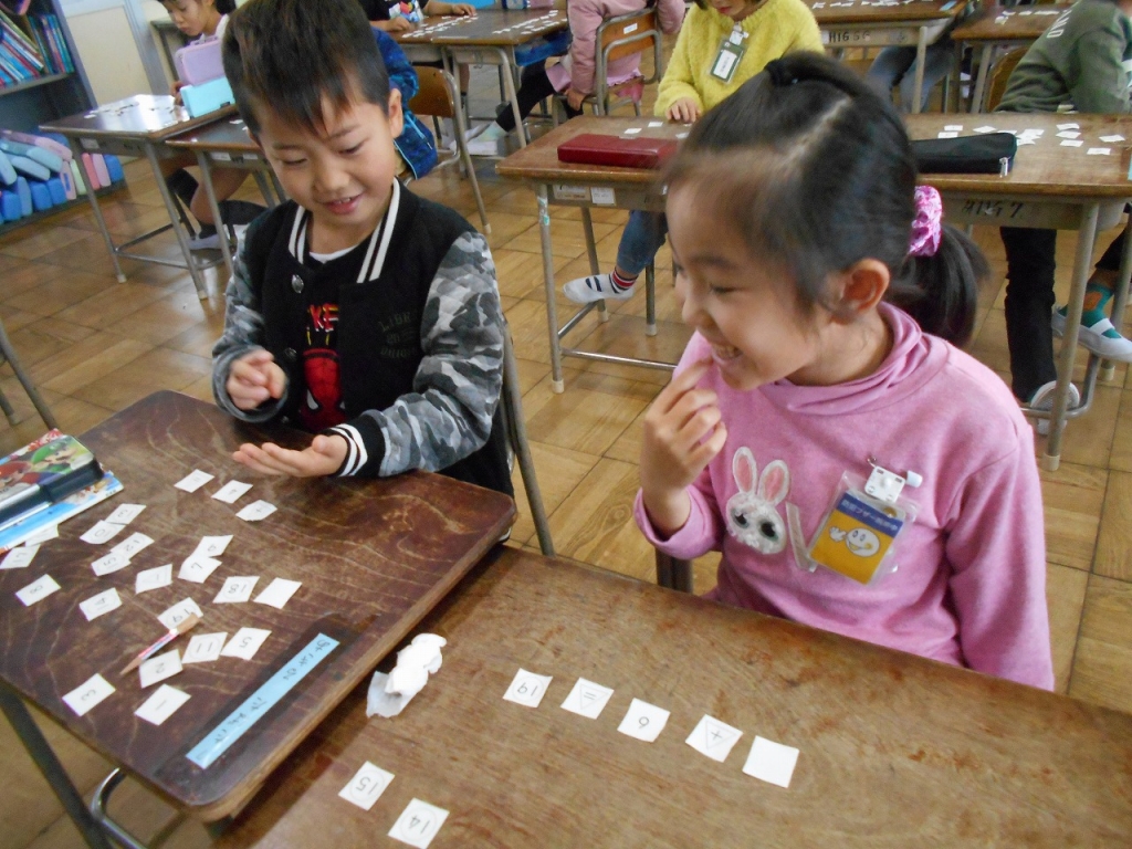 子どもたちは、ひき算カードを使って、何度も繰り返し唱えて練習をしています。