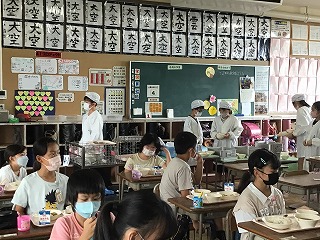 今日から給食や掃除も始まりました。久しぶりの給食でしたがみんなルールを守って準備や会食、片付けまでしっかりとできていました。みんな新品の食缶や食器を見てとてもうれしそうでした。大切に使って、これからもきれいな食缶と食器を保っていきたいですね!