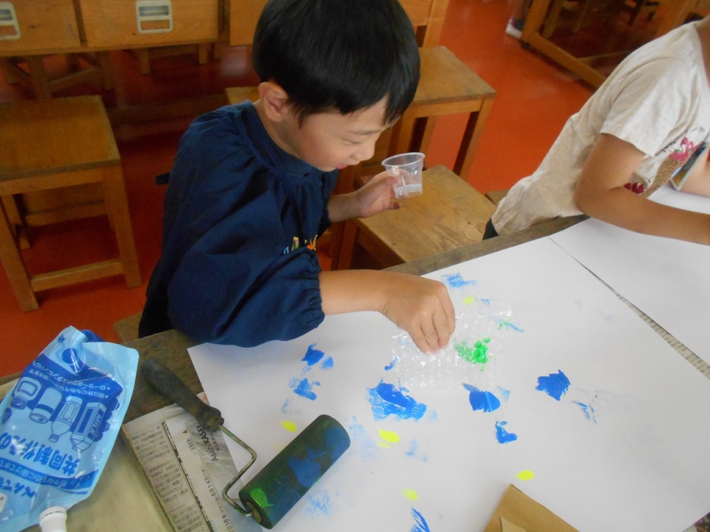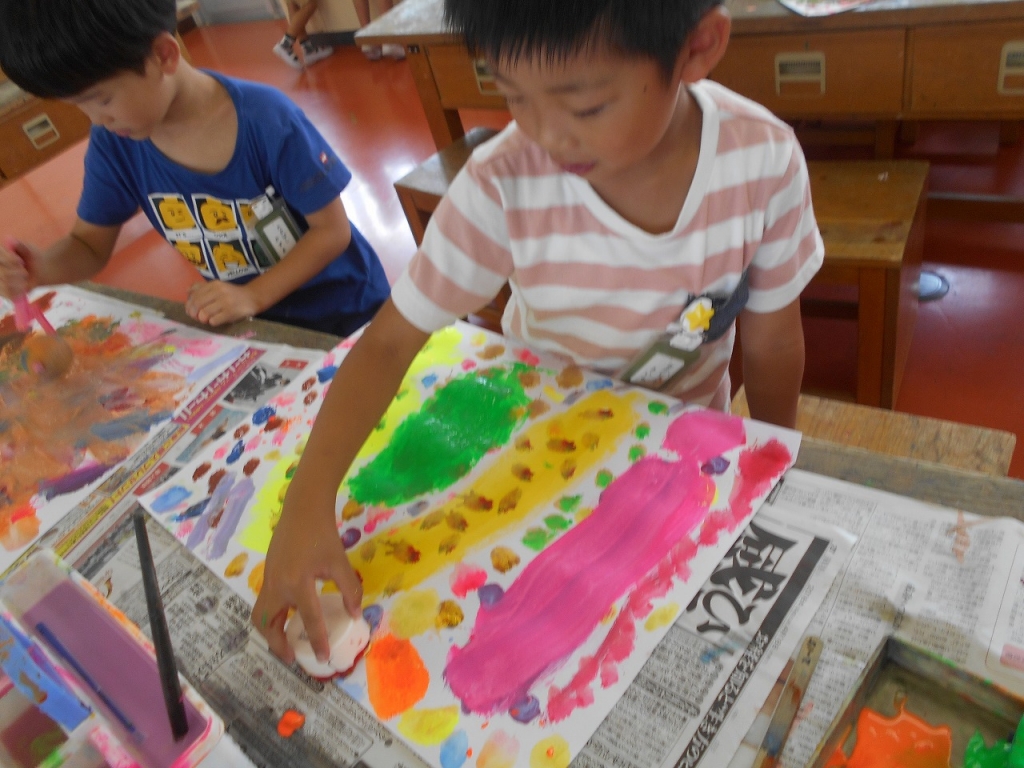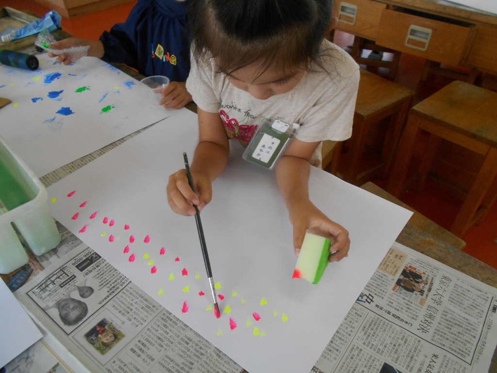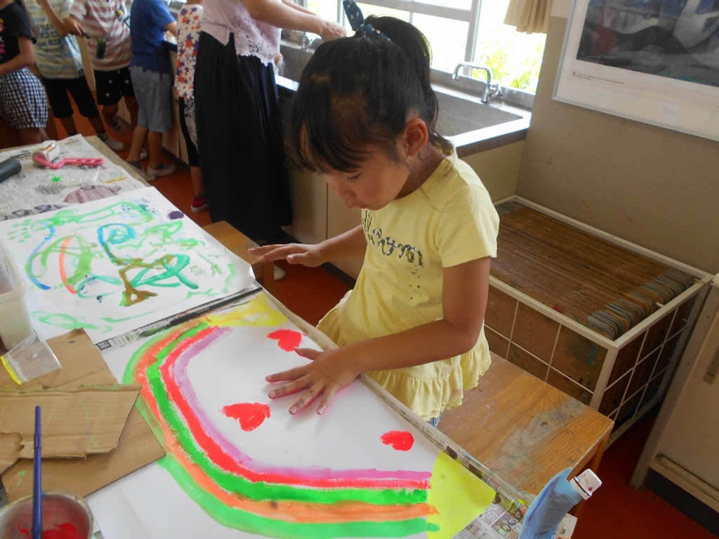 絵の具やブラシ、ローラーなどの道具を使ったり、手形を押したりしました。