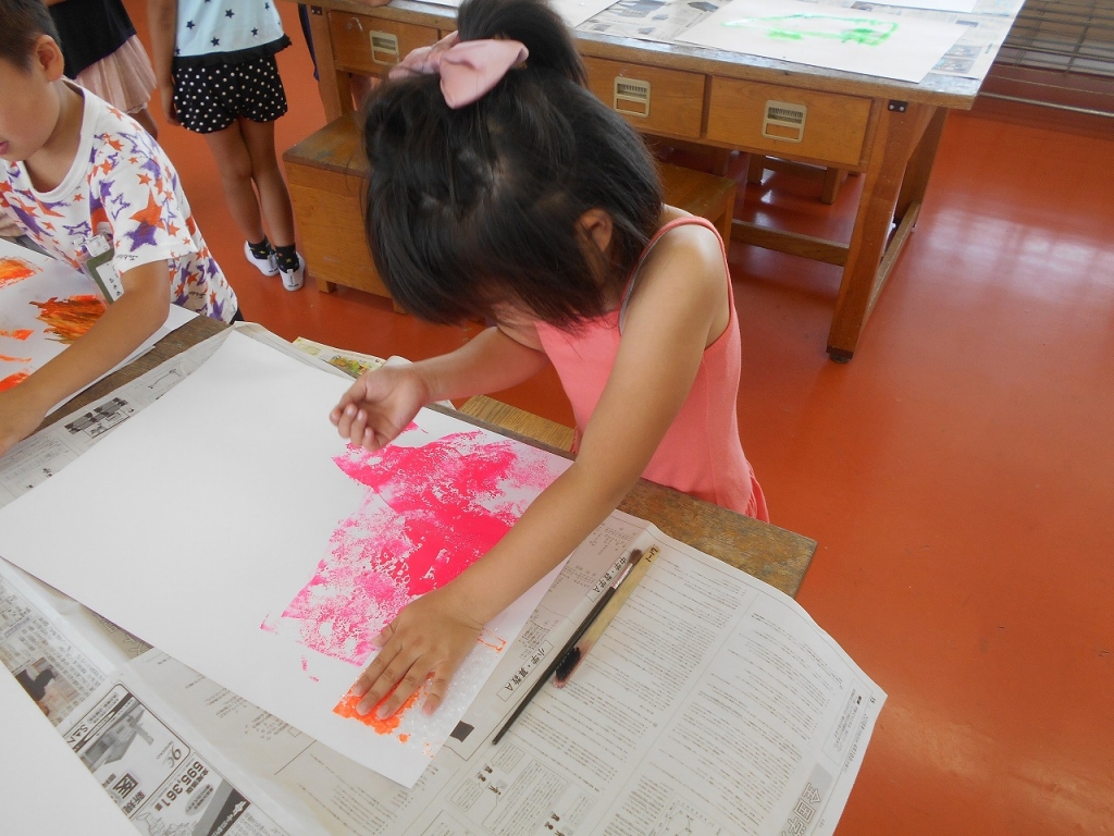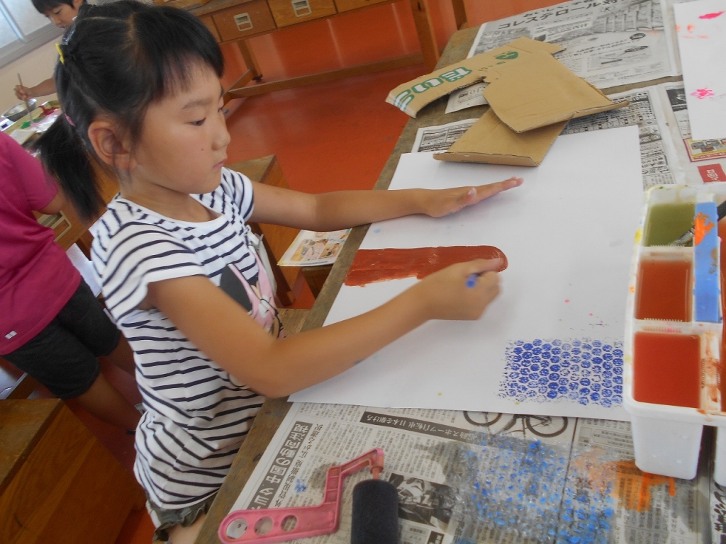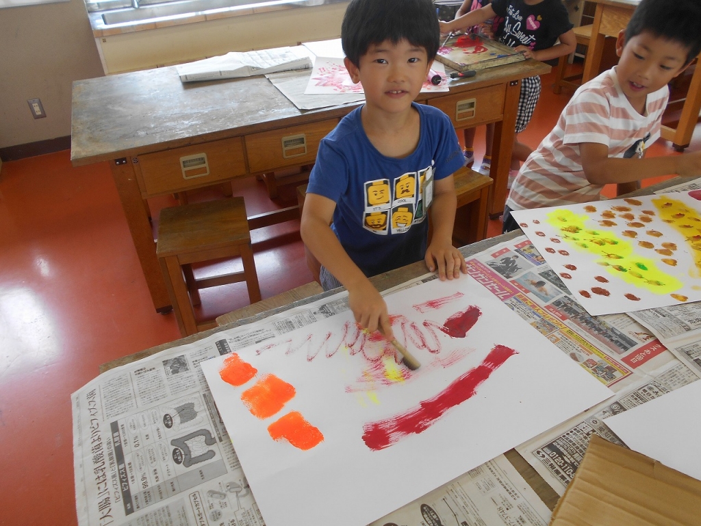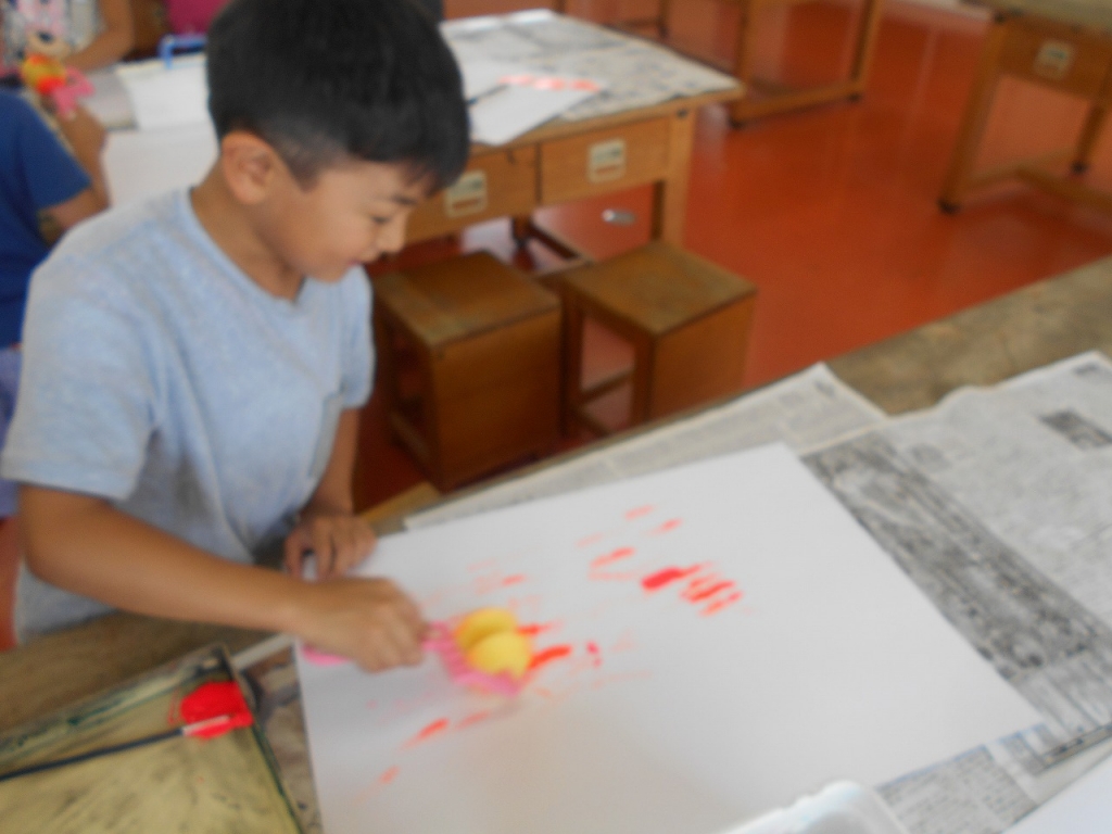 絵の具やブラシ、ローラーなどの道具を使ったり、手形を押したりしました。