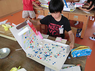 コロコロガーレという題材の、ビー玉迷路を作りました。カラフルダンボールや工作用紙、さらに身近なものを使って、すべり台や落とし穴、隠し扉など様々な仕掛けを作り、個性豊かな作品を作り上げました。