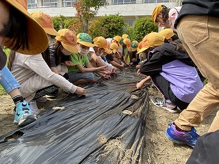 学活でトウモロコシとエダマメの種を植えました。みんなで夏休み前に食べたいなと思っています。これからもう少し野菜の種類を増やす予定です。この野菜作りを通して、SDGsについても考えていきましょうね!