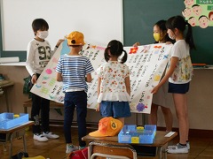 紙についている飾りは、4年生が折り紙や画用紙で1年生が喜んでくれるようなものを考えて作ったものです。