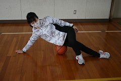 まずは準備運動で、太ももをストレッチしていきます。今回はストレッチにボールなどの丸いものを使います。これは、できるだけカタイものの方がしっかりほぐせます。