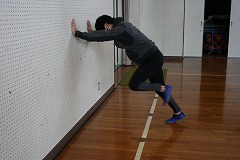 1 かべから1歩はなれたところに立ち、かべに手をつきます。