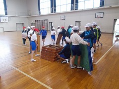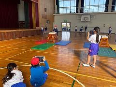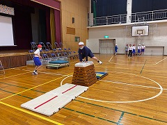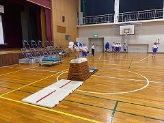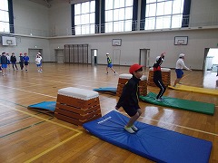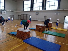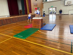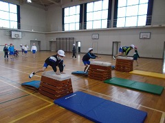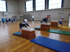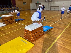 開脚跳び、台上前転の基本の技や、抱え込み跳びなどの発展技にも挑戦しています。