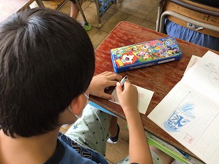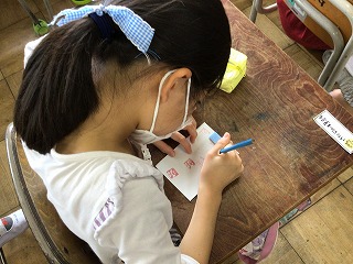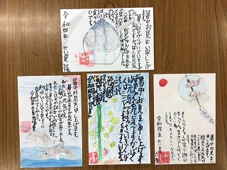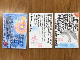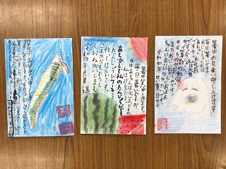 暑中見舞いに手作りのハンコを作って、自分の好きな位置に押して、最後の仕上げをしました。ハンコは4月に作ったことがあったので、15分ほどでできていました。手作りハンコを押すと、さらに本格的な暑中見舞いになりましたね。