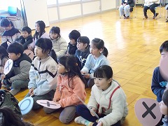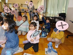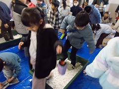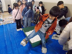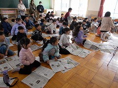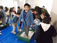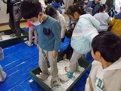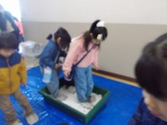 作ったスリッパで、ガラスに見立てたものの上を歩きました。靴の代わりになり、「痛くない」と歩いていました。