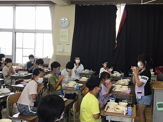 給食の時間になると、給食当番・給食ワゴン係・配膳台を並べる係・配膳台と机をふく係・黒板のカーテンを閉める係が目的をもって行動しています。さらに、当番や係ではない子も、準備をしてすぐに着席して待っています。『クラスのチームワーク』ですね!