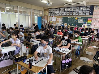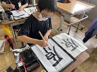 お手本をよく見て、正しい姿勢や筆の使い方に気を付けながら、真剣に書いています。普段は、活発に発言したり大きな声で音読したりしている授業ですが、書写の授業は、とても静かな時間が流れます。