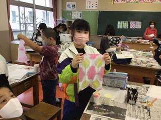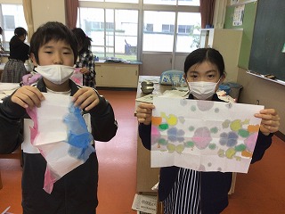 習字の半紙を絵の具で染めたり、小さい風船に水のりで紙を貼ったり、、、。楽しみながらみんなで楽しく作業しています。