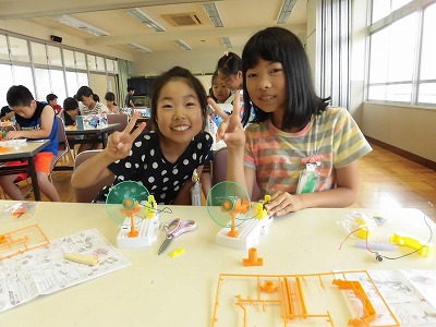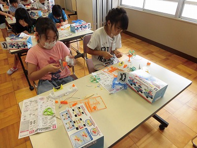 乾電池をつかい、電気の力でモーターを回しました。