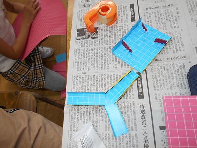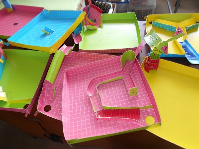 ビー玉を転がしてアイデアいっぱいの楽しく遊べるコースを考えています。