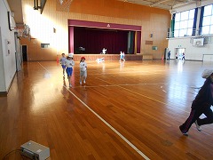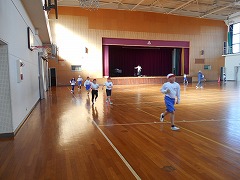 「マット運動あそび」に入り、冷えた体をリズムジャンプが終わった後に曲が終わるまでランニングをして温めました。