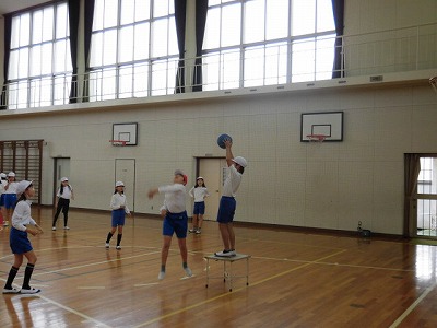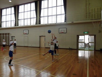 体育のポートボールでは、4つのチームに分かれてシュート練習をしています。