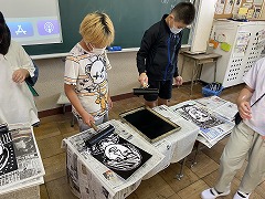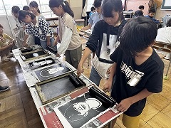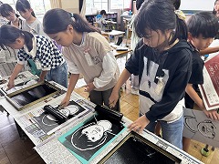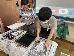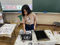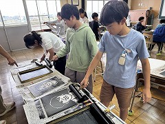 図工の時間には、彫り終わった作品を刷る作業をしました。