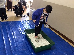 2つ目は新聞紙で作ったスリッパでガラスに見立てたものの上を歩きました。新聞紙で手軽にスリッパが作れて、驚いていました。本日、お家に持ち帰ったのでご家庭でも作ってみてください。