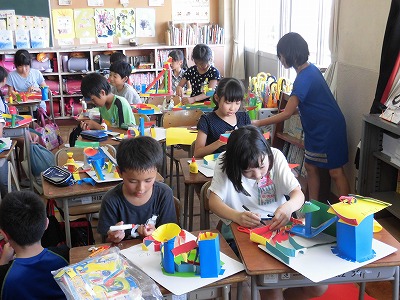 図工では、段ボール台紙やカラー波段ボールを切ったり、曲げてカーブやトンネルを作ったりしてビー玉をころころと転がすおもちゃ作りをしています。