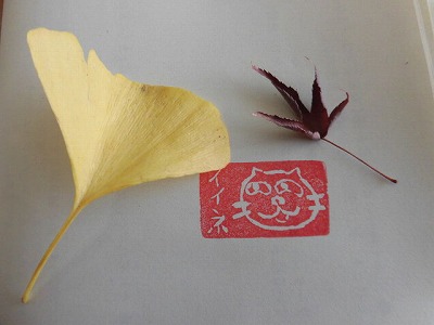 学級の子が、イチョウとカエデの葉を教室にもってきてくれました。