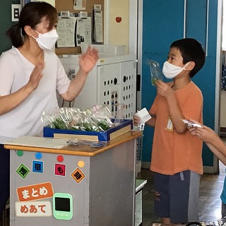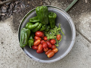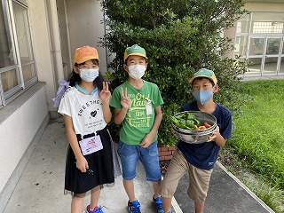 登校後、身の回りの準備が早く終わった子に育てている野菜の収穫をしてもらいました。びっくりするほど大きく育ったピーマン、つやつやのミニトマト、青々としたエダマメ、どれも立派に育ってくれました。水やりをがんばったかいがありましたね!