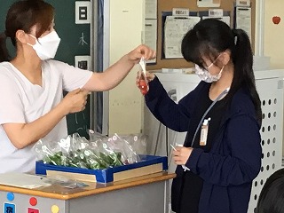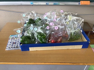 4時間目の後半は、ビンゴ大会をしました。その景品が朝収穫したばかりの野菜たちです。おいしかったかな?お家に帰って食べた感想を出校日に教えてください!